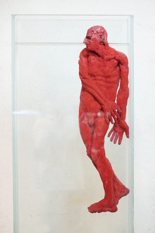 Cătălin Bădărău (b. 1981) is a sculptor and Assistant Professor in the Sculpture Department of the National University of Arts Bucharest’s Faculty of Fine Arts. His sculptural approaches deal with expressions of the human body under pressure, suspended or submerged in liquids. His works are part of carefully crafted installations, directly interacting with their environment. Carved or molded in polyurethane or synthetic resins, the parts of the imagined human bodies are hung, sunk or laid down on different metal structures, materializing the idea of a heavy metal pressure on the softness of human flesh. Many of his works depict persons with physical and psychic disabilities in oder to reveal today’s forms of violence, with its multiple physical and psychological effects. While being the locus where his disturbing vision takes shape, Bădărău’s studio is also a space of social events, meeting with friends, having fun, listening to music, and cooking.