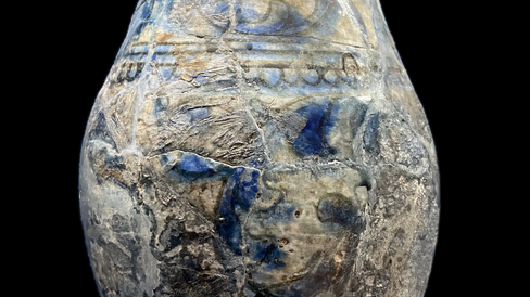 The vessel, a wonderful, skillfully made vase dating back to the 18th century, was discovered in 1999 in the ruins of a house which had burnt down. It was produced in one of the ceramic workshops of the great economic center of Kutahya, a city in Western Anatolia, Turkey. The vase has a floral decoration, a watery blue background on its entire surface, as well as thick black outlines.